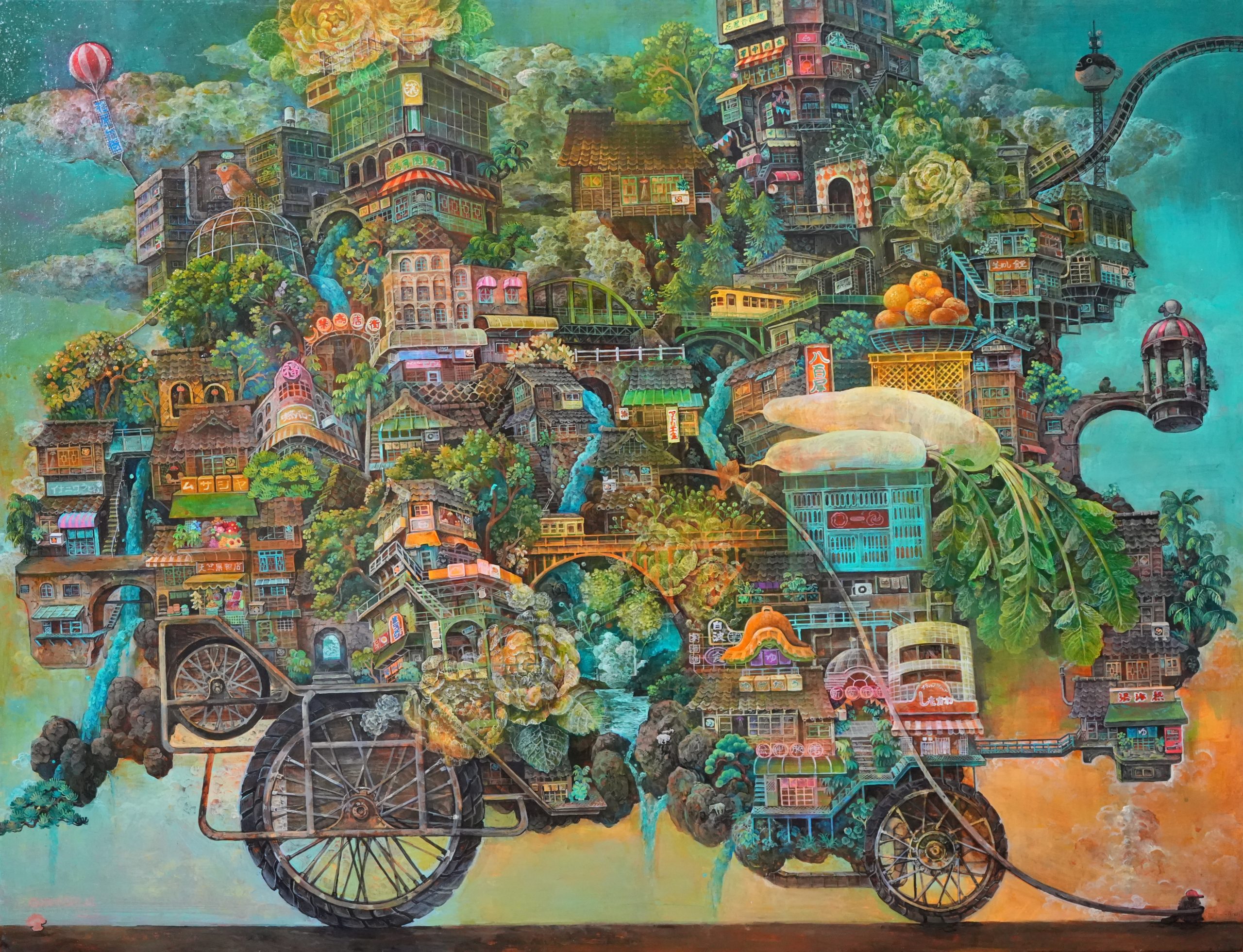 幻界集落 街屋台 幻界集落 街屋台 幻界集落 街屋台 幻界集落 街屋台 /h500×w655×d25/ 木製パネルに綿布、アクリル絵の具/ Cotton cloth, acrylic paint on wooden panel/ 木板上棉布、丙烯颜料/ 木板上棉布、壓克力顏料/