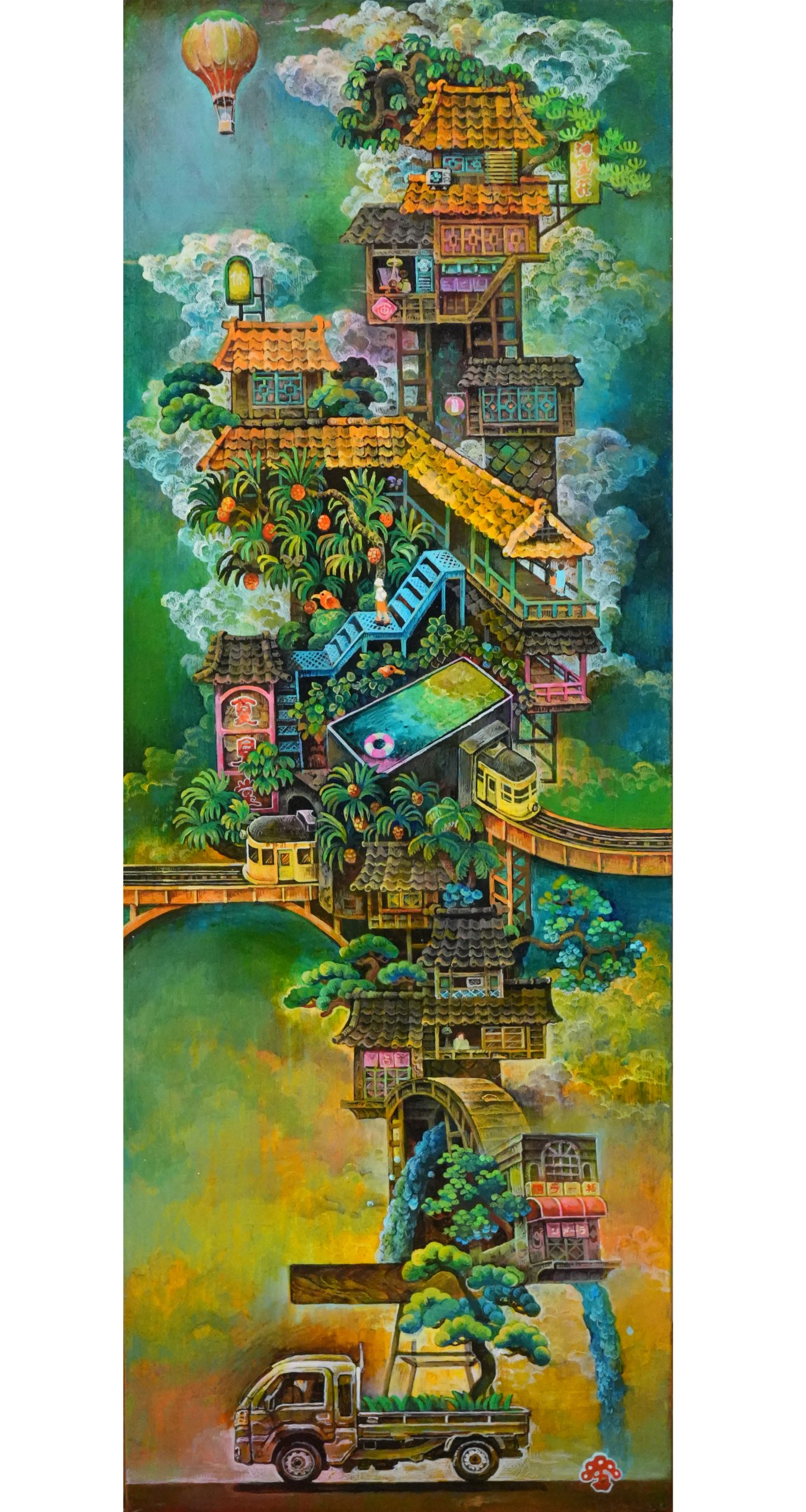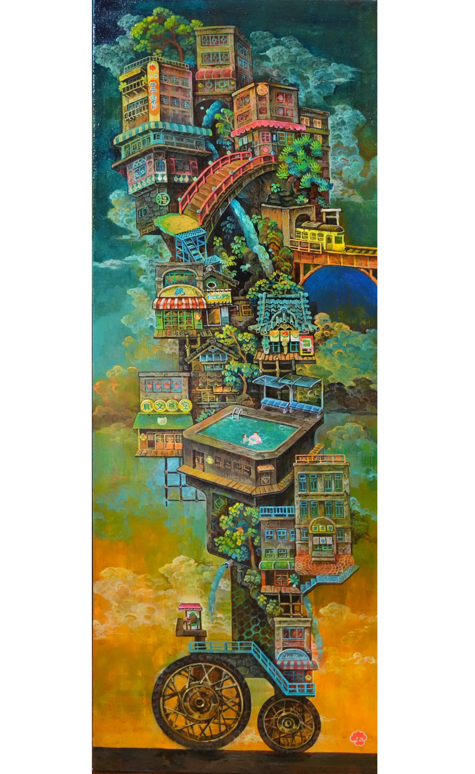 I create imaginary cities layered with intricate detail, inspired by the festival floats (yamakasa) from my hometown that left a deep impression on me. Trains often appear in my work as a symbol of longing—a wish for places beyond the city I know.