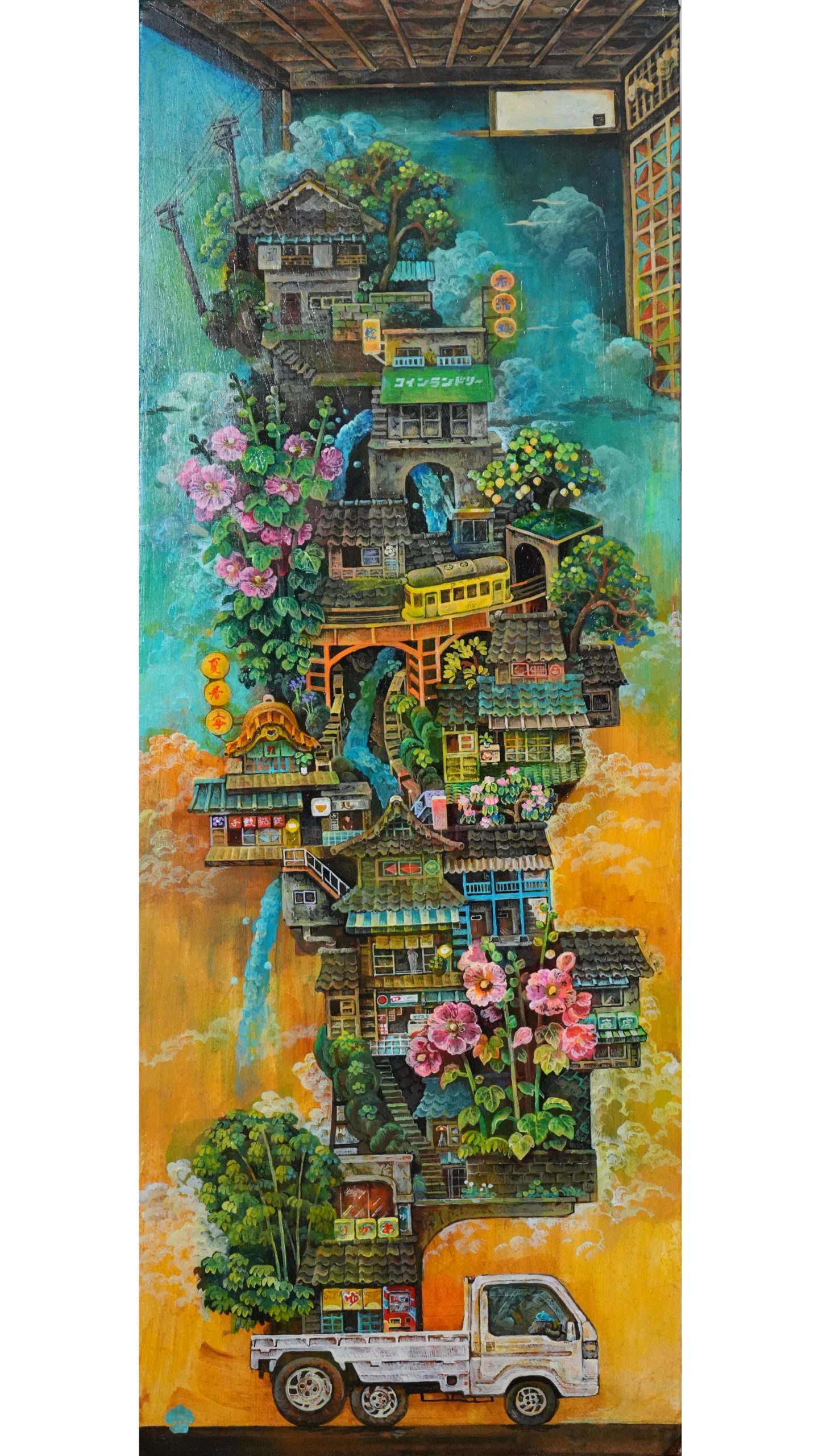 常夏屋台街 常夏屋台街 常夏屋台街 常夏屋台街 /h450×w160×d23/ 木製パネルに綿布、アクリル絵の具/ Cotton cloth, acrylic paint on wooden panel/ 木板上棉布、丙烯颜料/ 木板上棉布、壓克力顏料/