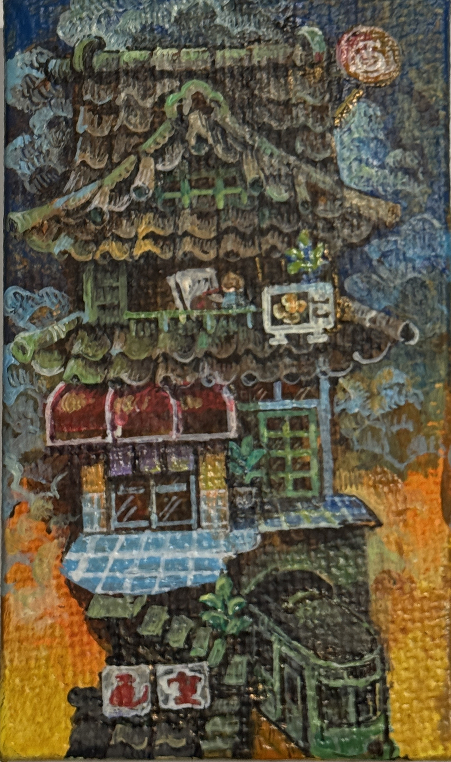 月と街屋台 月と街屋台 月と街屋台 月と街屋台 /h450×w160×d23/ 木製パネルに綿布、アクリル絵の具/ Cotton cloth, acrylic paint on wooden panel/ 木板上棉布、丙烯颜料/ 木板上棉布、壓克力顏料/